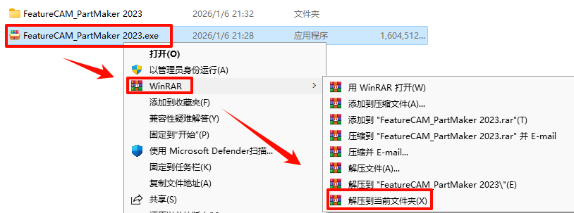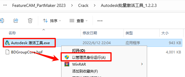 8.返回之前解压的“FeatureCAM_PartMaker 2023”文件夹,依次打开“Crack——Autodesk批量激活工具_1.2.2.3”文件夹,选中“Autodesk 激活工具.exe”文件,鼠标右键选择“以管理员身份运行”