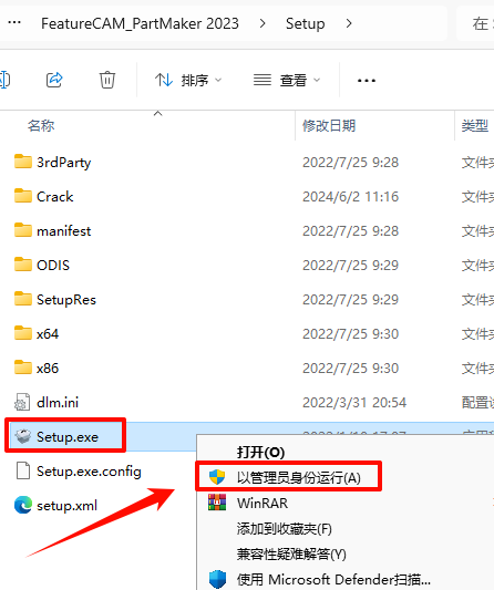 2.打开刚刚解压的文件夹,双击打开“Setup”文件夹,鼠标右键点击“Setup.exe”选择“以管理员身份运行”