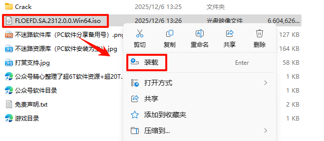 2.´ò¿ª¸Õ¸Õ½âѹµÄÎļþ¼Ð£¬Êó±êÓÒ¼üµã»÷“FLOEFD.SA.2312.0.0.Win64.iso”Îļþ£¬Ñ¡Ôñ“×°ÔØ”£¨Èç¹ûûÓÐ“×°ÔØ”Ñ¡ÏîµÄ¿ÉÒÔÓÒ¼üÑ¡Ôñ“´ò¿ª·½Ê½—Windows×ÊÔ´¹ÜÀíÆ÷”´ò¿ª£©