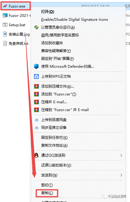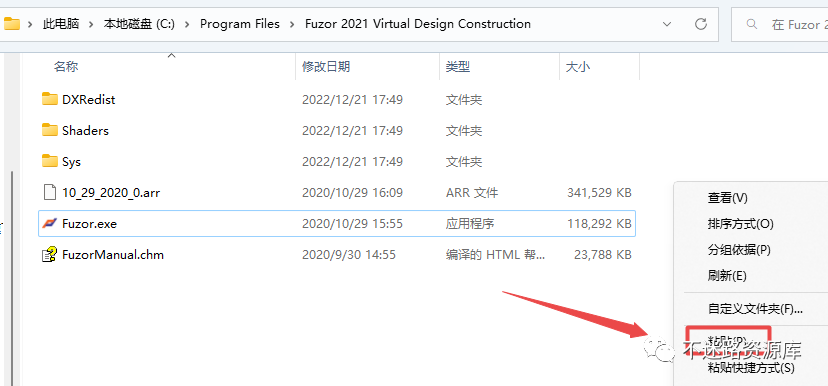 6.·µ»ØÖ®Ç°½âѹµÄ“Fuzor2021”Îļþ¼Ð£¬Êó±êÓÒ¼üµã»÷“Fuzor.exe”Ñ¡Ôñ“¸´ÖÆ”