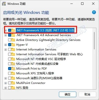 如果没有安装按以下步骤操作,点选“.NET Framework 3.5”,点击“确定”,等待更改完成,点击“关闭”(若出现其他提示点击“让Windows更新为你下载文件”,等待下载安装完成即可)