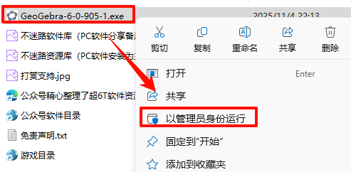 2.´ò¿ª¸Õ¸Õ½âѹµÄÎļþ¼Ð£¬Êó±êÓÒ¼üµã»÷“GeoGebra-6-0-905-1.exe”Ñ¡Ôñ“ÒÔ¹ÜÀíÔ±Éí·ÝÔËÐД£¬Èí¼þ¾²Ä¬°²×°£¬²¢ÔÚ×ÀÃæÉÏÉú³ÉÈí¼þ¿ì½Ýͼ±ê