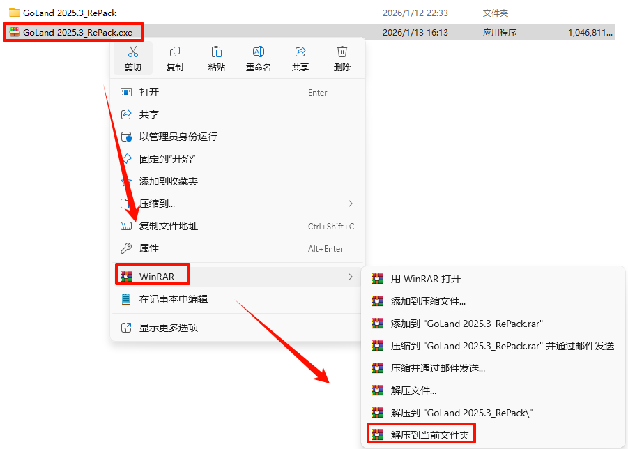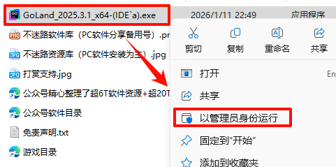 2.´ò¿ª¸Õ¸Õ½âѹµÄÎļþ¼Ð£¬Êó±êÓÒ¼üµã»÷“GoLand_2025.3.1_x64-(IDE`a).exe”Ñ¡Ôñ“ÒÔ¹ÜÀíÔ±Éí·ÝÔËÐД