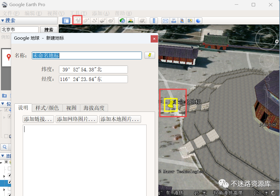7、点击菜单栏中的绘制多边形、添加地标功能,可在谷歌地球中绘制多边形以及添加地标,并保存至左侧位置窗口,在左侧位置窗口双击添加的多边形或地标即可快速到达目标所在位置。