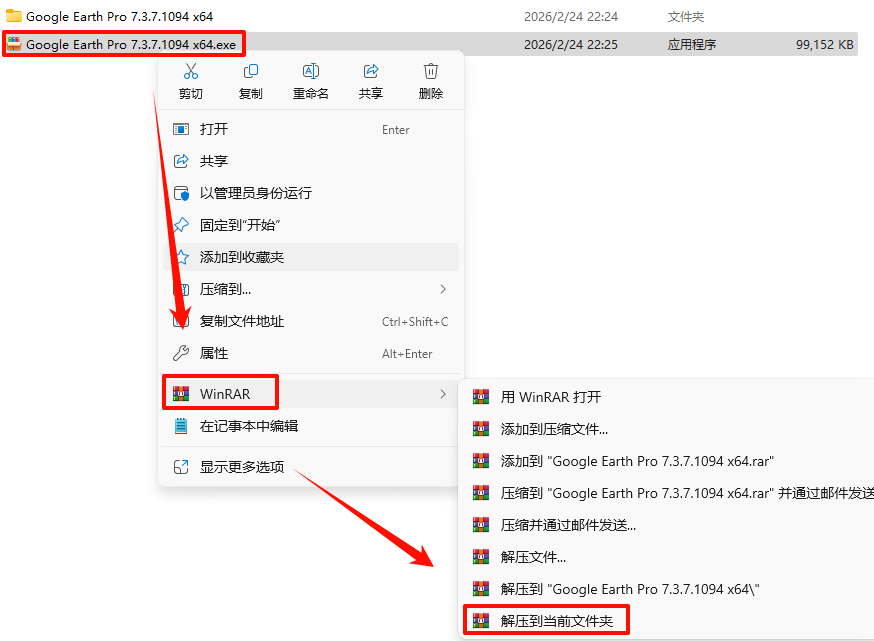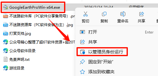 2.打开刚刚解压的文件夹,选中“GoogleEarthProWin-x64.exe”文件,鼠标右键选择“以管理员身份运行”