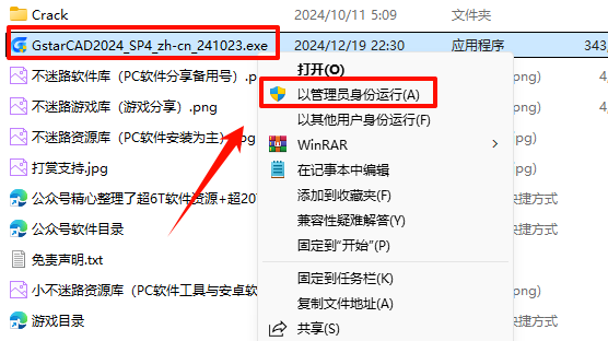 2.打开刚刚解压的文件夹,鼠标右键点击“GstarCAD2024_SP4_zh-cn_241023.exe”选择“以管理员身份运行”