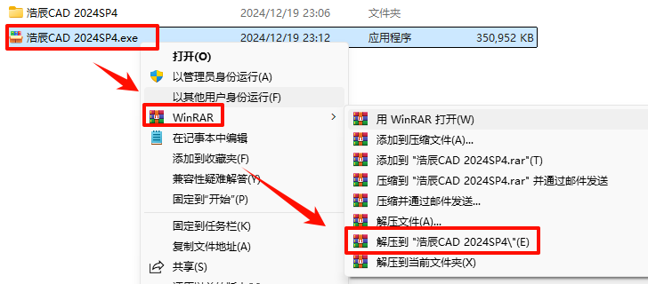 1.选中下载的压缩包,然后鼠标右键选择解压到“浩辰CAD 2024SP4”