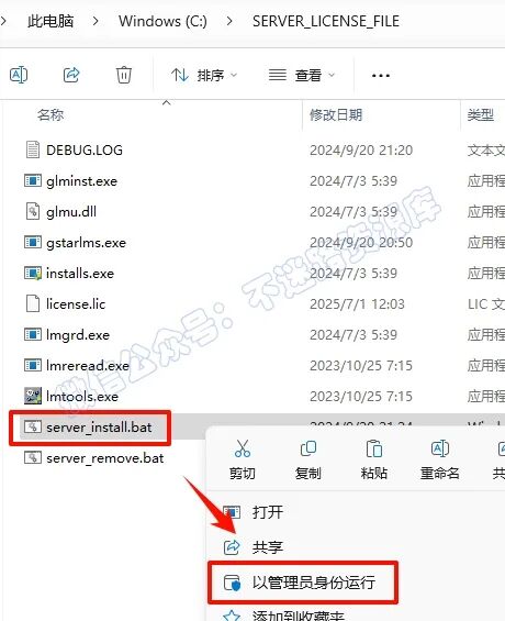 10.打开复制到C盘的“SERVER_LICENSE_FILE“文件夹,鼠标右键点击“server_install.bat”选择“以管理员身份运行”