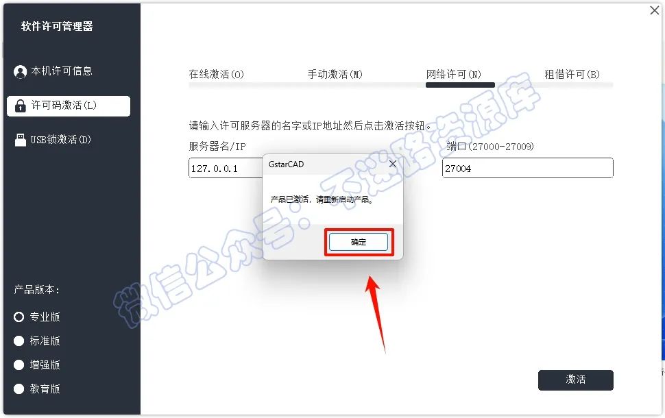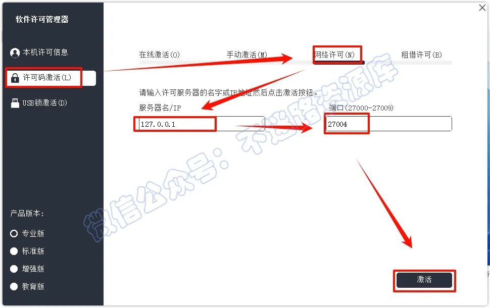 18.点击“许可码激活”-“网络许可”,服务器名输入:127.0.0.1,端口输入:27004,点击“激活”