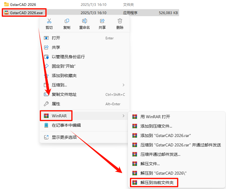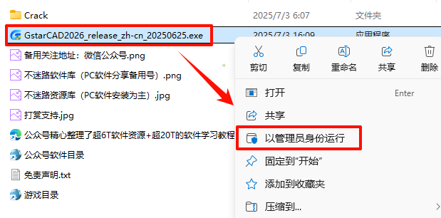 2.打开刚刚解压的文件夹,鼠标右键点击“GstarCAD2026_release_zh-cn_20250625.exe”选择“以管理员身份运行”