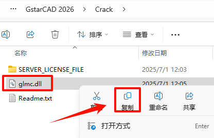 8.返回之前解压的“GstarCAD 2026”文件夹,双击打开“Crack”文件夹,鼠标右键击“SERVER_LICENSE_FILE”文件夹选择“复制”