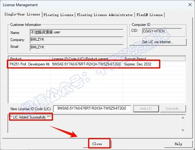 14.Ìáʾ“LIC Added Sucessfully”£¬±íÊ¾ÆÆ½â³É¹¦Ðí¿ÉÖ¤µ½2032Äê²Å¹ýÆÚ£¬µã»÷“Close”