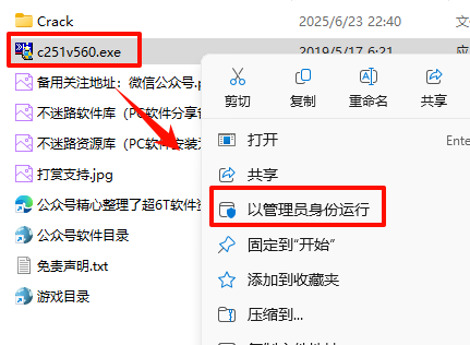 2.´ò¿ª¸Õ¸Õ½âѹµÄÎļþ¼Ð£¬Ñ¡ÖГc251v560.exe”Îļþ£¬Êó±êÓÒ¼üµã»÷“ÒÔ¹ÜÀíÔ±Éí·ÝÔËÐД