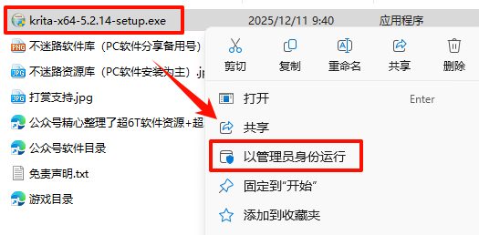2.´ò¿ª¸Õ¸Õ½âѹµÄÎļþ¼Ð£¬Êó±êÓÒ¼üµã»÷“krita-x64-5.2.14-setup”Ñ¡Ôñ“ÒÔ¹ÜÀíÔ±Éí·ÝÔËÐД