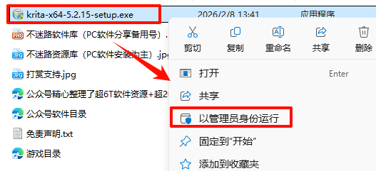 2.´ò¿ª¸Õ¸Õ½âѹµÄÎļþ¼Ð£¬Êó±êÓÒ¼üµã»÷“krita-x64-5.2.14-setup”Ñ¡Ôñ“ÒÔ¹ÜÀíÔ±Éí·ÝÔËÐД