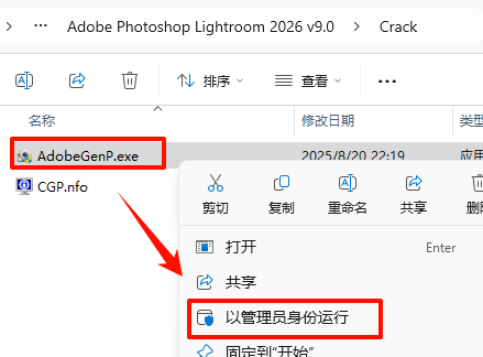 6.·µ»ØÖ®Ç°½âѹµÄ“Adobe Photoshop Lightroom 2026 v9.0”Îļþ¼Ð£¬Ë«»÷´ò¿ª“Crack”Îļþ¼Ð£¬Ñ¡ÖГAdobeGenP.exe”Îļþ,Êó±êÓÒ¼üµã»÷“ÒÔ¹ÜÀíÔ±Éí·ÝÔËÐД