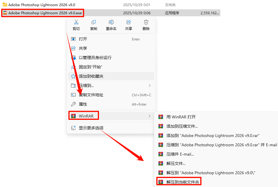 1.½øÈëÏÂÔØÁ´½ÓÏÂÔØ“Adobe Lightroom 2026 v9.0”°²×°°ü£¬Ñ¡ÖÐÏÂÔØµÄ°²×°°ü£¬Êó±êÓÒ¼üÑ¡Ôñ“½âѹµ½µ±Ç°Îļþ¼Ð”