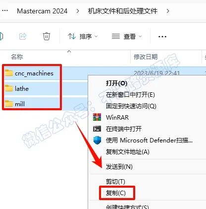 26.返回之前解压的“Mastercam 2024”文件夹,双击打开“机床文件和后处理文件”文件夹,选中该文件夹下的全部文件,鼠标右键点击“复制”