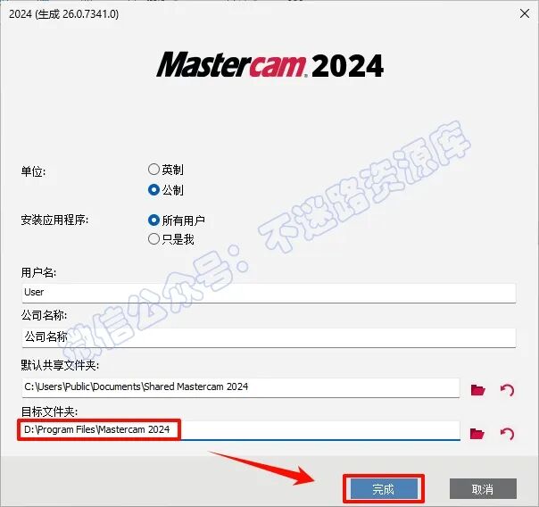 6.选择软件安装路径,建议和教程中的保持一致,本例安装到D盘(将路径地址中的首字符C改为D表示安装到D盘,安装路径不要出现中文),点击”完成“