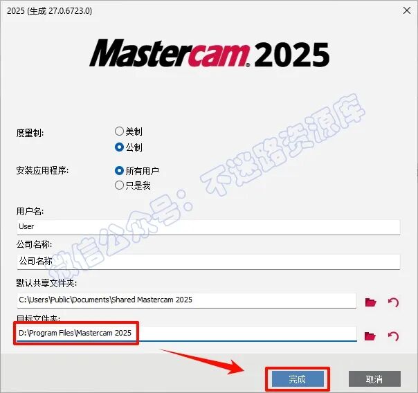 6.选择软件安装路径,建议和教程中的保持一致,本例安装到D盘(将路径地址中的首字符C改为D表示安装到D盘,安装路径不要出现中文),点击”完成“