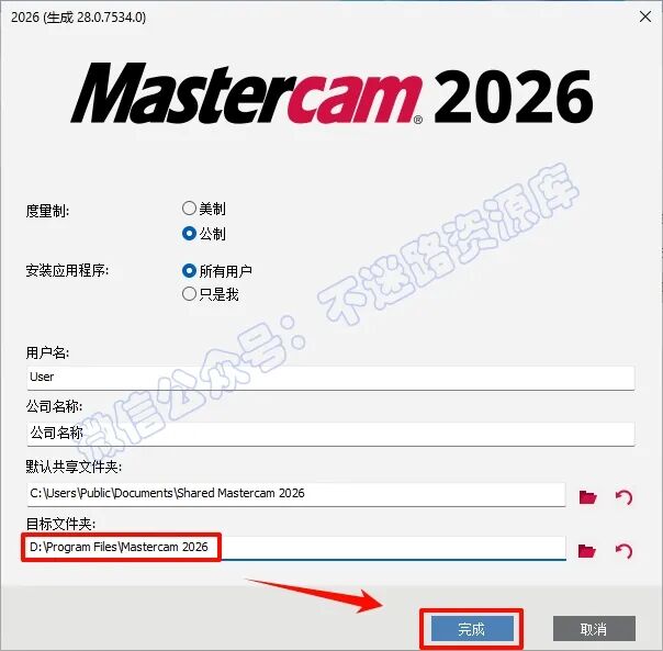 6.选择软件安装路径,建议和教程中的保持一致,本例安装到D盘(将路径地址中的首字符C改为D表示安装到D盘,安装路径不要出现中文),点击”完成“
