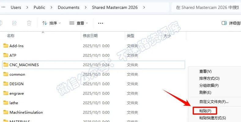 23.返回打开的“Shared Mastercam 2026”文件夹,在空白处鼠标右键“粘贴”刚才复制的文件