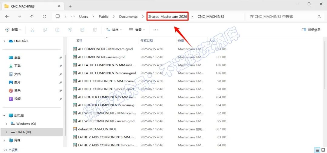 22.返回之前解压的“Mastercam 2026”文件夹,双击打开“机床文件后处理”文件夹,选中该文件夹下的全部文件,鼠标右键点击“复制”
