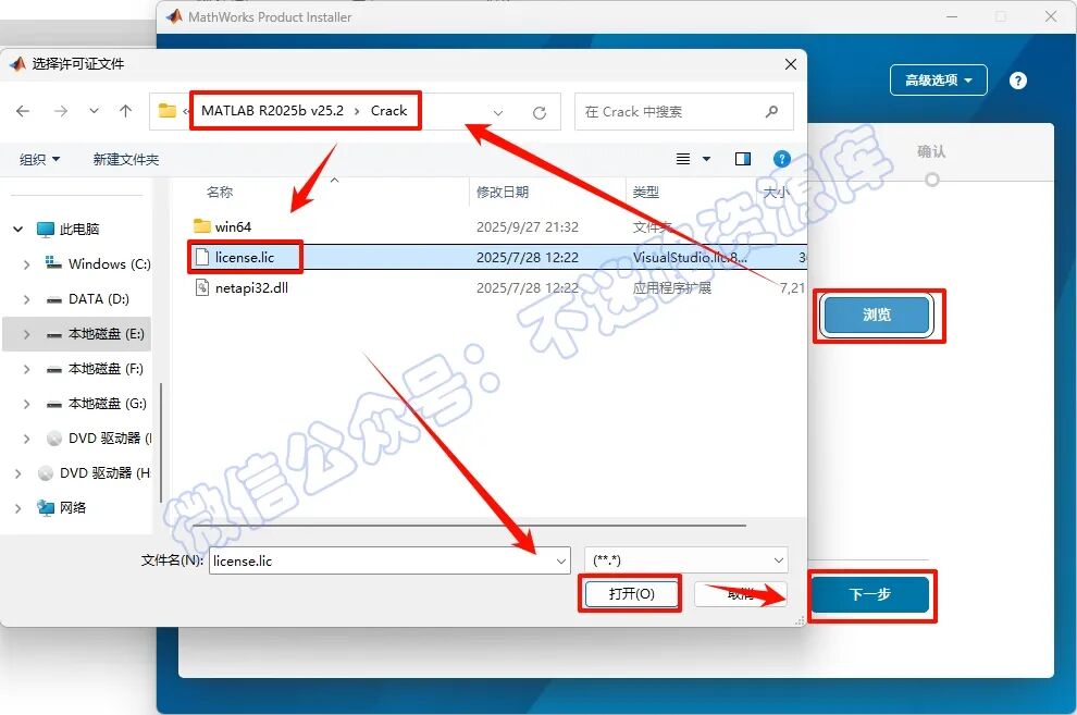 7.µã»÷“ä¯ÀÀ”£¬ÕÒµ½½âѹºóµÄ“MATLAB R2025b v25.2”Îļþ¼Ð·¾¶£¬´ò¿ª“Crack”Îļþ¼Ð£¬Ñ¡ÖГlicense.lic”Îļþ£¬µã»÷“´ò¿ª”£¬µã»÷“ÏÂÒ»²½”(·¾¶²»ÒªÓÐÖÐÎÄ)