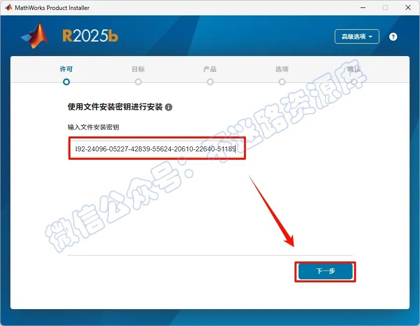 6.ÔÚÊäÈëÎļþ°²×°ÃÜÔ¿ÊäÈë¿òÖÐÊäÈ룺“63733-59078-50866-02827-32355-07987-57979-17850-05492-24096-05227-42839-55624-20610-22640-51189”£¬µã»÷“ÏÂÒ»²½”