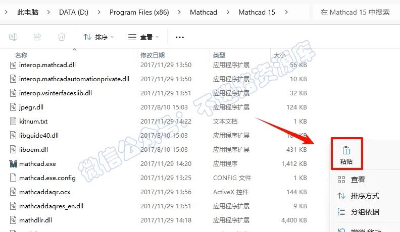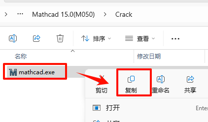 15.·µ»ØÖ®Ç°½âѹµÄ“Mathcad 15.0(M050)”Îļþ¼Ð£¬Ë«»÷´ò¿ª“Crack”Îļþ¼Ð£¬Ñ¡ÖГmathcad.exe”Îļþ£¬Êó±êÓÒ¼üµã»÷“¸´ÖÆ”