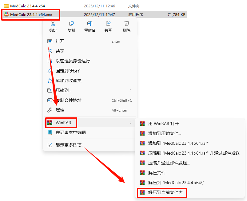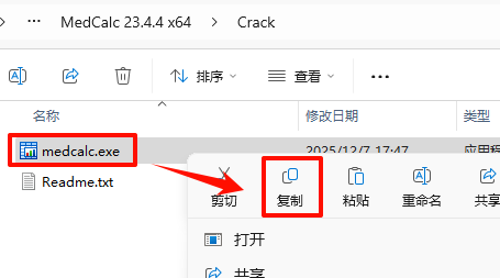 8.·µ»ØÖ®Ç°½âѹµÄ“MedCalc 23.4.4 x64”Îļþ¼Ð£¬Ë«»÷´ò¿ª”Crack“Îļþ¼Ð£¬Ñ¡ÖÐ"medcalc.exe"Îļþ£¬Êó±êÓÒ¼üµã»÷“¸´ÖÆ”