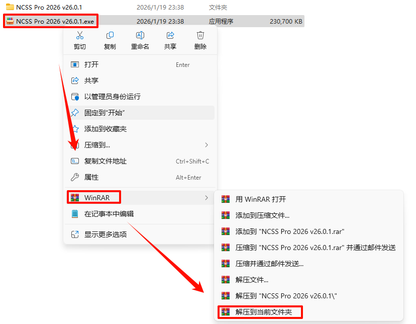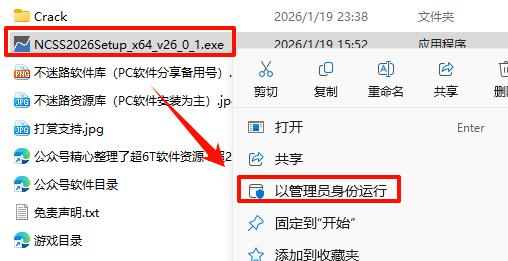 2.´ò¿ª¸Õ¸Õ½âѹµÄÎļþ¼Ð£¬Êó±êÓÒ¼üµã»÷“NCSS2026Setup_x64_v26_0_1.exe”Ñ¡Ôñ“ÒÔ¹ÜÀíÔ±Éí·ÝÔËÐД
