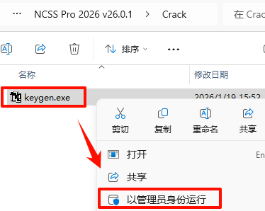 11.·µ»ØÖ®Ç°½âѹµÄ“NCSS Pro 2026 v26.0.1”Îļþ¼Ð£¬Ë«»÷´ò¿ª“Crack”Îļþ¼Ð£¬Ñ¡ÖГKeygen.exe”Îļþ£¬Êó±êÓÒ¼üµã»÷“ÒÔ¹ÜÀíÔ±Éí·ÝÔËÐД