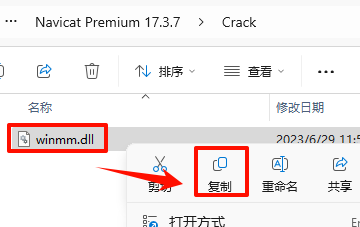 10.·µ»ØÖ®Ç°½âѹµÄ“Navicat Premium 17.3.7”Îļþ¼Ð£¬Ë«»÷´ò¿ª“Crack”Îļþ¼Ð£¬Ñ¡ÖГwinmm.dll”Îļþ£¬Êó±êÓÒ¼üÑ¡Ôñ“¸´ÖÆ”