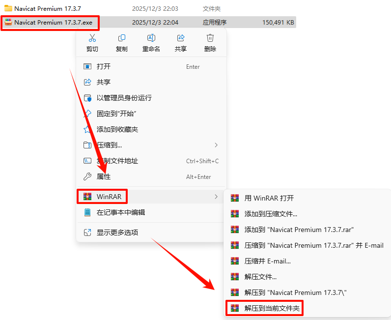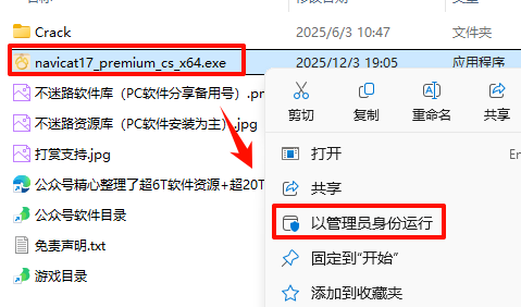 2.´ò¿ª¸Õ¸Õ½âѹµÄÎļþ¼Ð£¬Êó±êÓÒ¼üµã»÷“navicat17_premium_cs_x64.exe”Ñ¡Ôñ“ÒÔ¹ÜÀíÔ±Éí·ÝÔËÐД