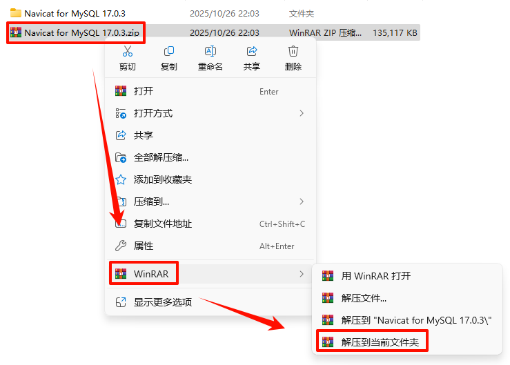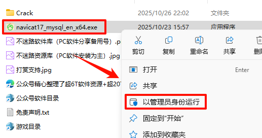 2.´ò¿ª¸Õ¸Õ½âѹµÄÎļþ¼Ð£¬Êó±êÓÒ¼üµã»÷“navicat17_mysql_en_x64.exe”Ñ¡Ôñ“ÒÔ¹ÜÀíÔ±Éí·ÝÔËÐД