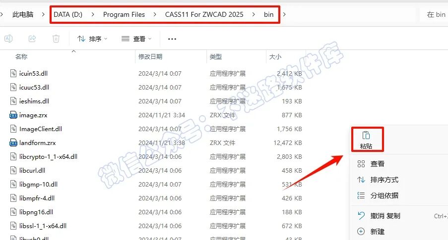 9.依次打开CASS11软件安装路径“D:\Program Files\CASS11 For ZWCAD 2025\bin”(参看第5步,红色字体是你安装的中望CAD版本),在打开的文件夹空白处,鼠标右键“粘贴”刚才复制的文件