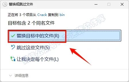 10.点击“替换目标中的文件“(若提示需要管理员权限,勾选“为所有...”,点击“继续”)