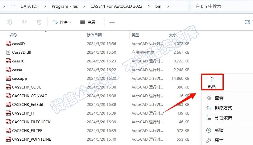9.依次打开CASS11软件安装路径“D:\Program Files\CASS11 For AutoCAD 2022\bin”(参看第5步,红色字体是你安装的CAD版本),在打开的文件夹空白处,鼠标右键“粘贴”刚才复制的文件