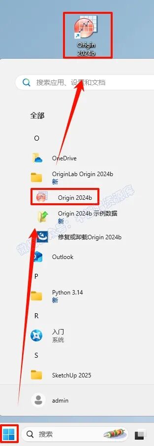 16.µã»÷“¿ªÊ¼“²Ëµ¥À¸£¬µã»÷“ËùÓÐÓ¦ÓÓ£¬ÕÒµ½“Origin 2024b“Èí¼þ£¬Êó±ê×ó¼üÍÏ×§µ½×ÀÃæÉϼ´¿É´´½¨×ÀÃæ¿ì½Ý·½Ê½