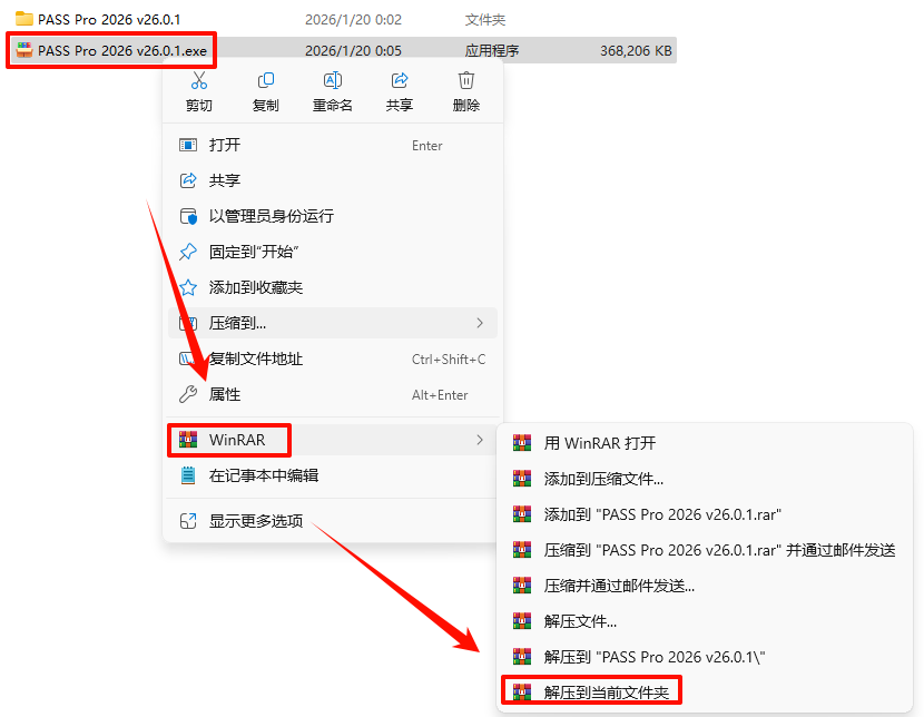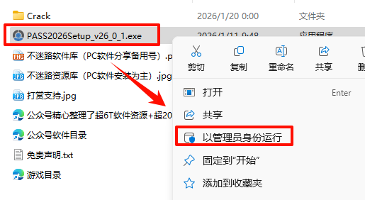 2.´ò¿ª¸Õ¸Õ½âѹµÄÎļþ¼Ð£¬Êó±êÓÒ¼üµã»÷“PASS2026Setup_v26_0_1.exe”Ñ¡Ôñ“ÒÔ¹ÜÀíÔ±Éí·ÝÔËÐД