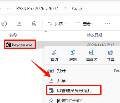 11.·µ»ØÖ®Ç°½âѹµÄ“PASS Pro 2026 v26.0.1”Îļþ¼Ð£¬Ë«»÷´ò¿ª“Crack”Îļþ¼Ð£¬Ñ¡ÖГKeygen.exe”Îļþ£¬Êó±êÓÒ¼üµã»÷“ÒÔ¹ÜÀíÔ±Éí·ÝÔËÐД