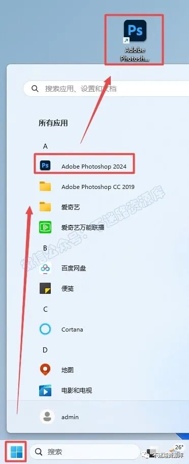 6.µã»÷“¿ªÊ¼“²Ëµ¥À¸£¬µã»÷“ËùÓÐÓ¦ÓÓ£¬ÕÒµ½“Adobe Photoshop 2024“Èí¼þ£¬Êó±ê×ó¼üÍÏ×§µ½×ÀÃæÉϼ´¿É´´½¨×ÀÃæ¿ì½Ý·½Ê½