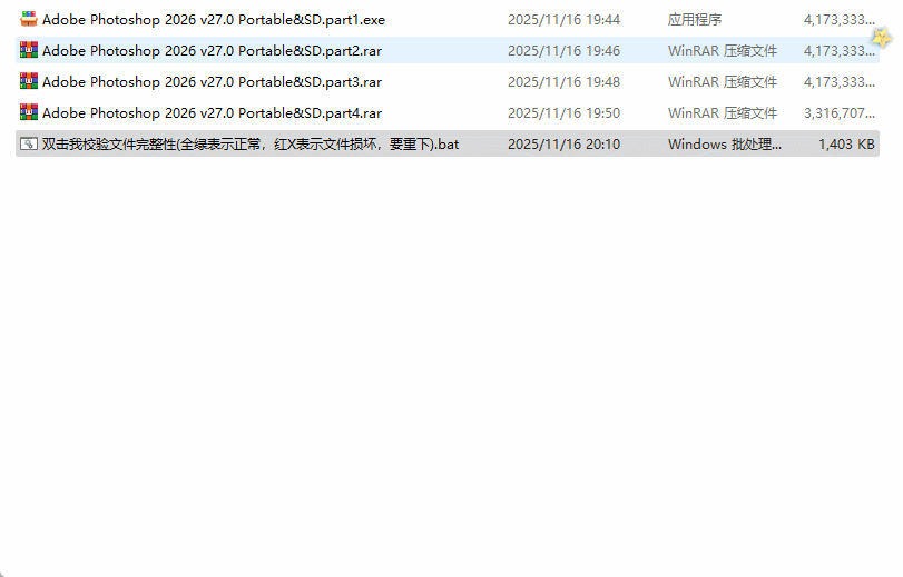 温馨提示:由于软件压缩包很大,所以安装前请先检测安装包的完整性。软件压缩包分成了多个分卷压缩包和一个校检文件验证器,下载完成后,双击打开“双击我校验文件完整性(全绿表示正常,红X表示文件损坏,要重下).bat”检测安装包是否完整!安装包文件在验证器中的提示绿色通过检验表示安装包没有问题。退出验证器。