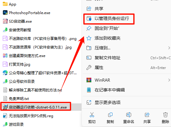 2.打开刚刚解压的文件夹,鼠标右键点击“启动器运行依赖-dotnet-6.0.11.exe”选择“以管理员身份运行”