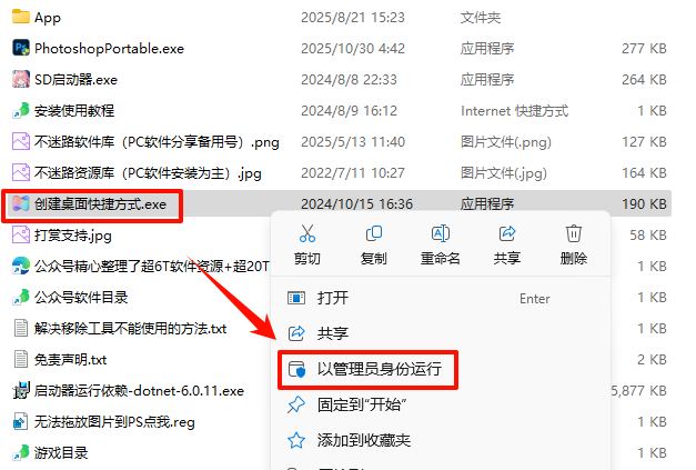 5.返回刚解压的文件夹,鼠标右键点击“创建桌面快捷方式”选择“以管理员身份运行”,生成桌面软件图标