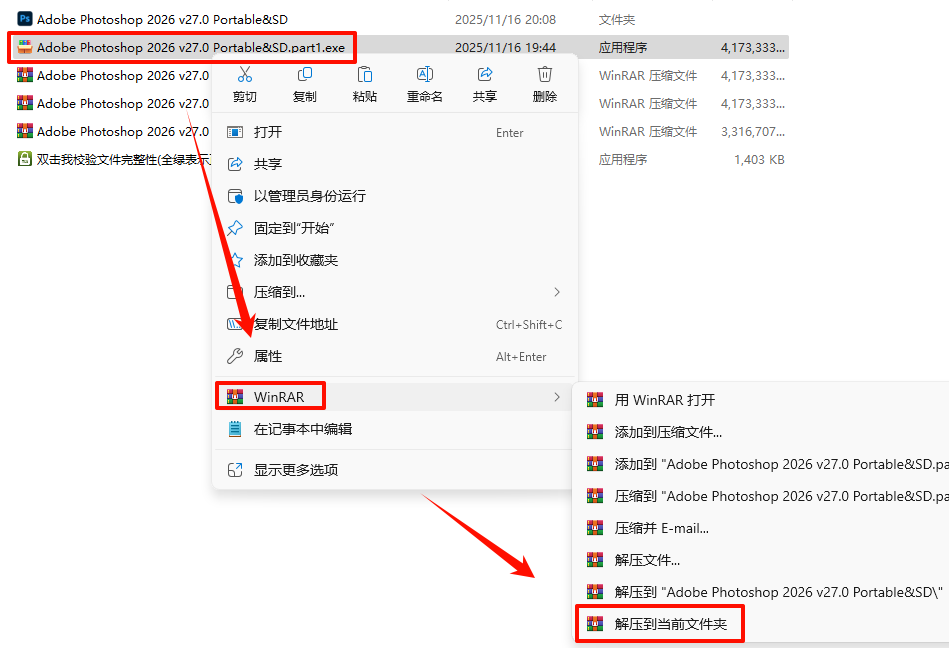 1.选中下载的压缩包,然后鼠标右键选择“解压到当前文件夹”