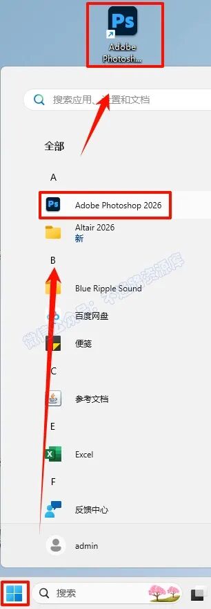 6.µã»÷“¿ªÊ¼“²Ëµ¥À¸£¬µã»÷“ËùÓÐÓ¦ÓÓ£¬ÕÒµ½“Adobe Photoshop“Èí¼þ£¬Êó±ê×ó¼üÍÏ×§µ½×ÀÃæÉϼ´¿É´´½¨×ÀÃæ¿ì½Ý·½Ê½