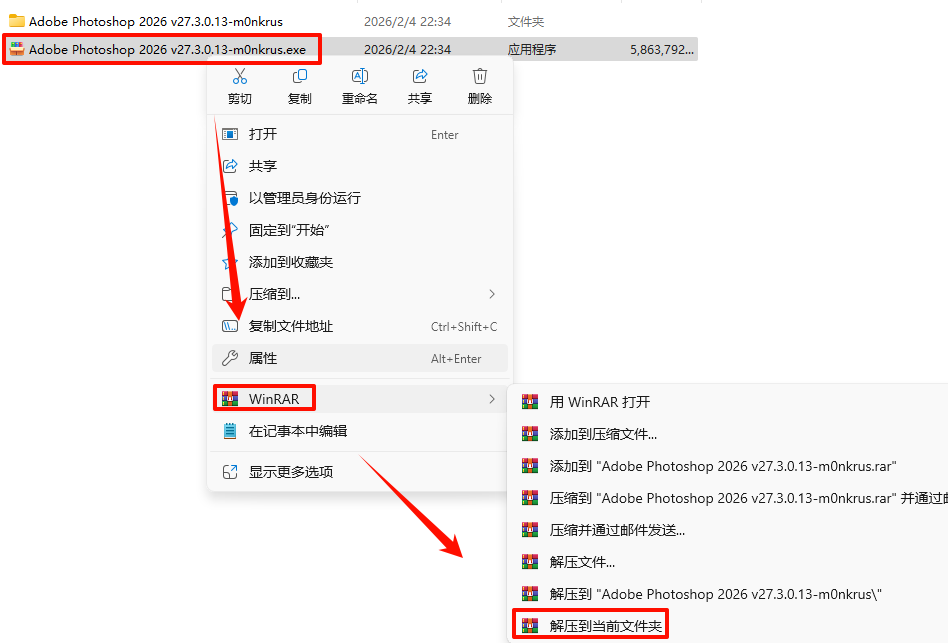 1.½øÈëÏÂÔØÁ´½ÓÏÂÔØ“Adobe Photoshop 2026 v27.3.0.13-m0nkrus”°²×°°ü£¬Ñ¡ÖÐÏÂÔØµÄ°²×°°ü£¬Êó±êÓÒ¼üÑ¡Ôñ“½âѹµ½µ±Ç°Îļþ¼Ð”