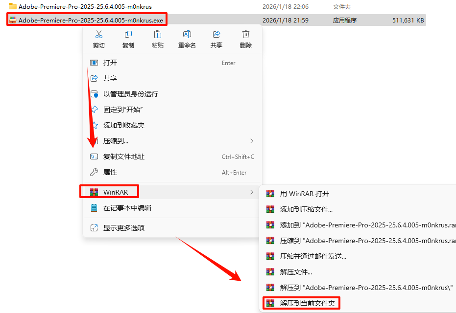 1.“Adobe-Premiere-Pro-2025-25.6.4.005-m0nkrus“°²×°°ü£¬Ñ¡ÖÐÏÂÔØµÄ°²×°°ü£¬Êó±êÓÒ¼üÑ¡ÔñÑ¡Ôñ“½âѹµ½µ±Ç°Îļþ¼Ð”